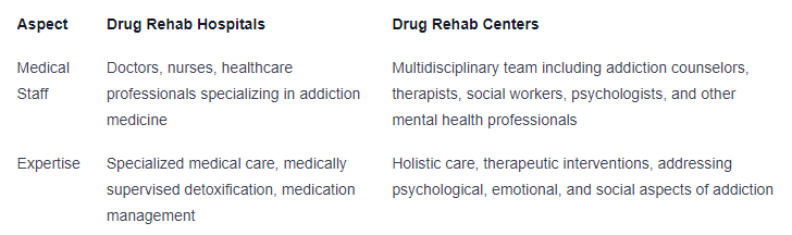 To better understand the differences in staff and expertise between drug rehab hospitals and centers, let's summarize the key points in a table:
