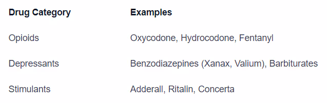 Commonly abused prescription drugs are medications that have a high potential for misuse, dependence, and addiction. These drugs are typically prescribed to treat medical conditions but can be misused for their euphoric effects or to self-medicate. Here are some examples of commonly abused prescription drugs: