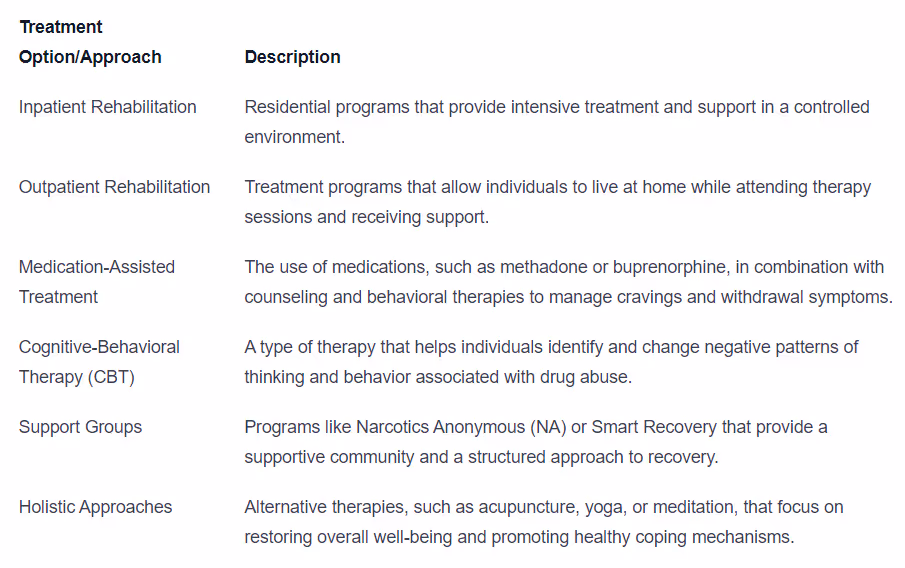 There are various treatment options and approaches available to individuals seeking to overcome prescription drug abuse. The most suitable approach depends on factors such as the severity of the addiction, the specific drug involved, and the individual's unique circumstances. Some common treatment options and approaches include: