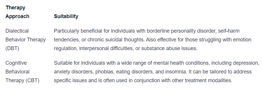 CBT, on the other hand, is suitable for individuals with various mental health conditions, including depression, anxiety disorders, phobias, eating disorders, and insomnia. It can be adapted to target specific issues and is often used alongside other treatment modalities.