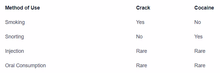 Here's a comparison of the methods of use for crack and cocaine: