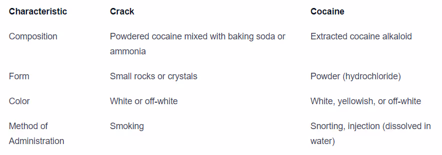Below is a comparison of the composition and form of crack and cocaine: