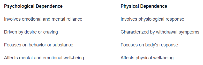 To further understand the differences between psychological and physical dependence, refer to the table below: